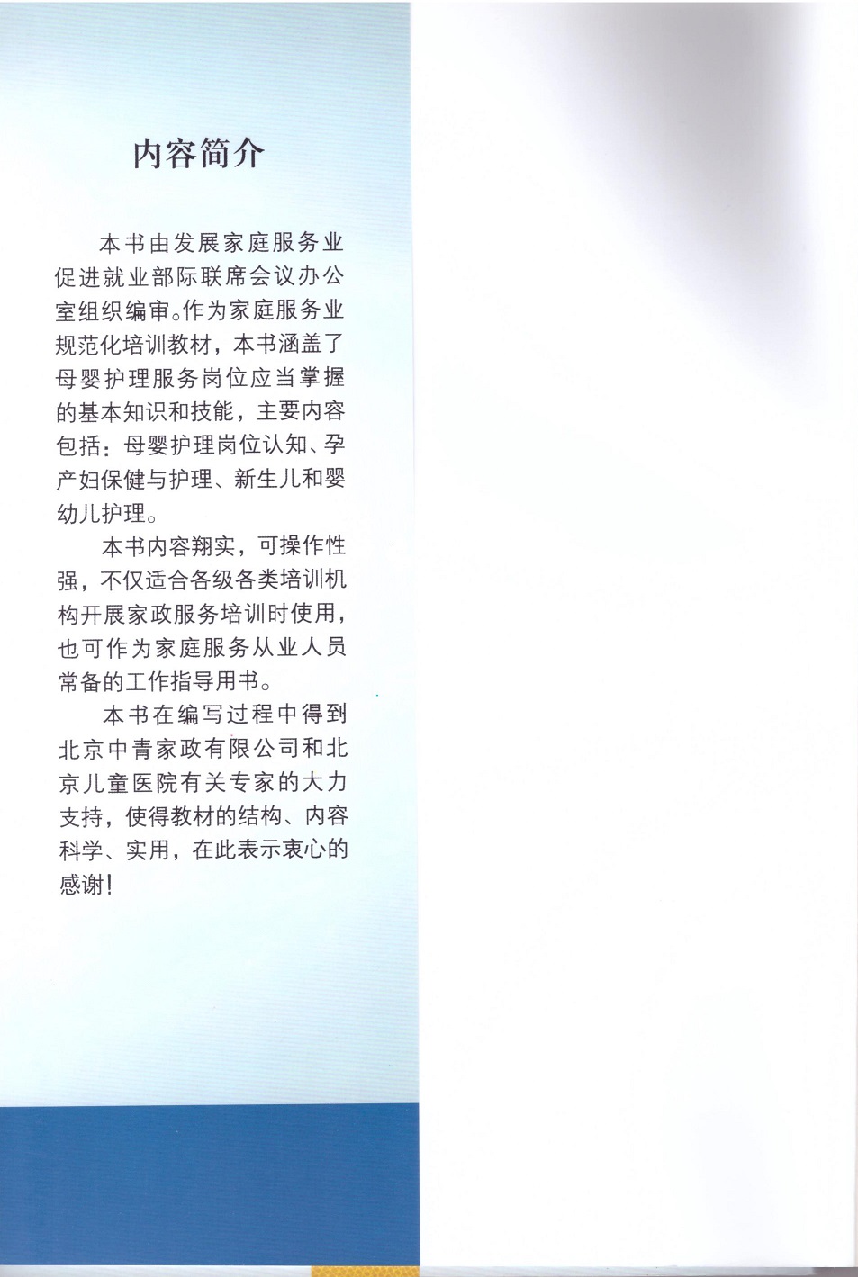 《母婴护理》家庭服务业规范化培训教材,由国务院发展家庭服务业促进就业部际联席会议办公室组织编审。北京中青家政有限公司董事长王君主编。