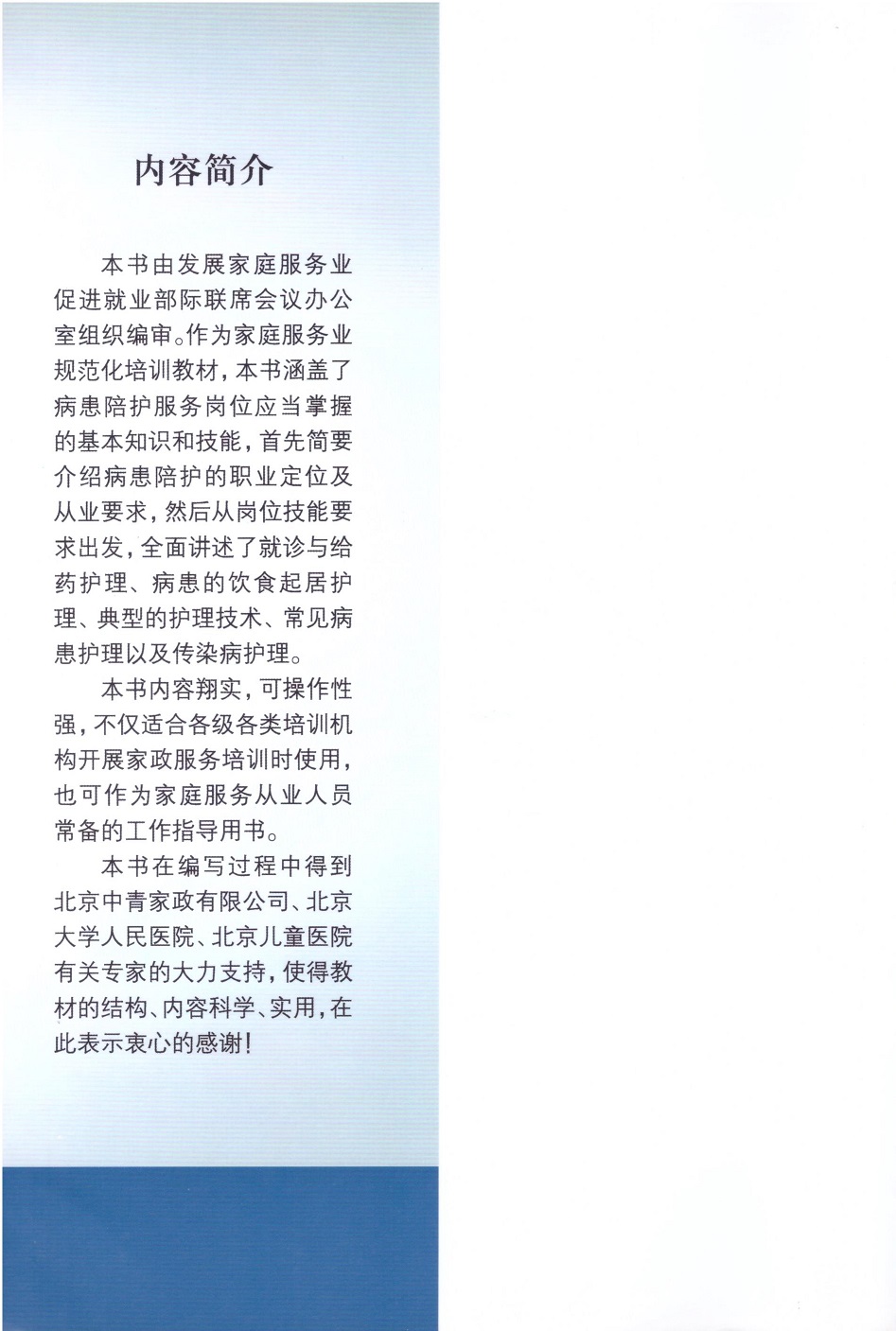 本书在编写过程中得到北京中青家政有限公司、北京大学人民医院、北京儿童医院有关专家的大力支持,使得教材的结构、内容更趋科学、合理、实用,在此表示衷心的感谢!